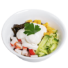 Кальмар копченый, майонез, яйцо отварное, сыр, лук маринованный.
